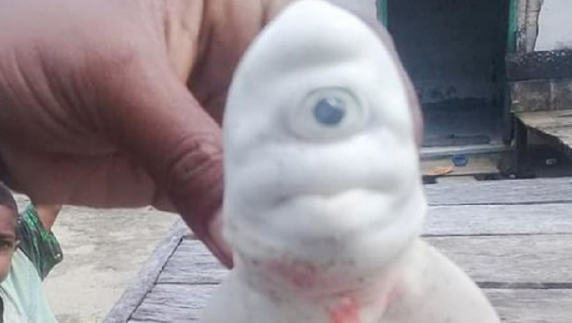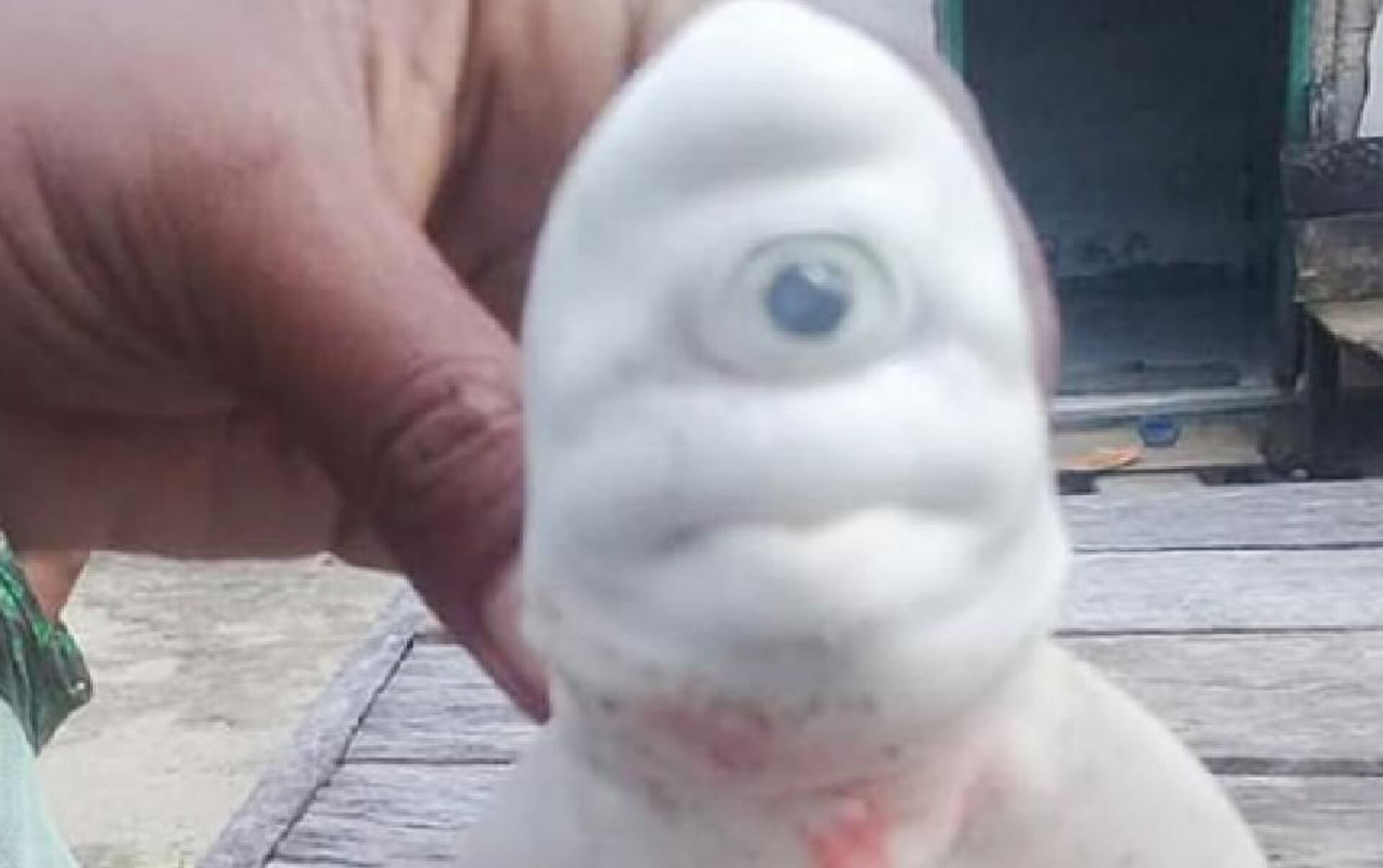 Endonezya’nın Maluku bölgesinde balıkçılar, ağlarına takılan köpekbalığının görünce büyük şaşkınlık yaşadı. Balıkçıların 10 Ekim’de yakaladığı köpekbalığının tek gözlü olduğu ve renginin tamamen beyaz olduğu görüldü.