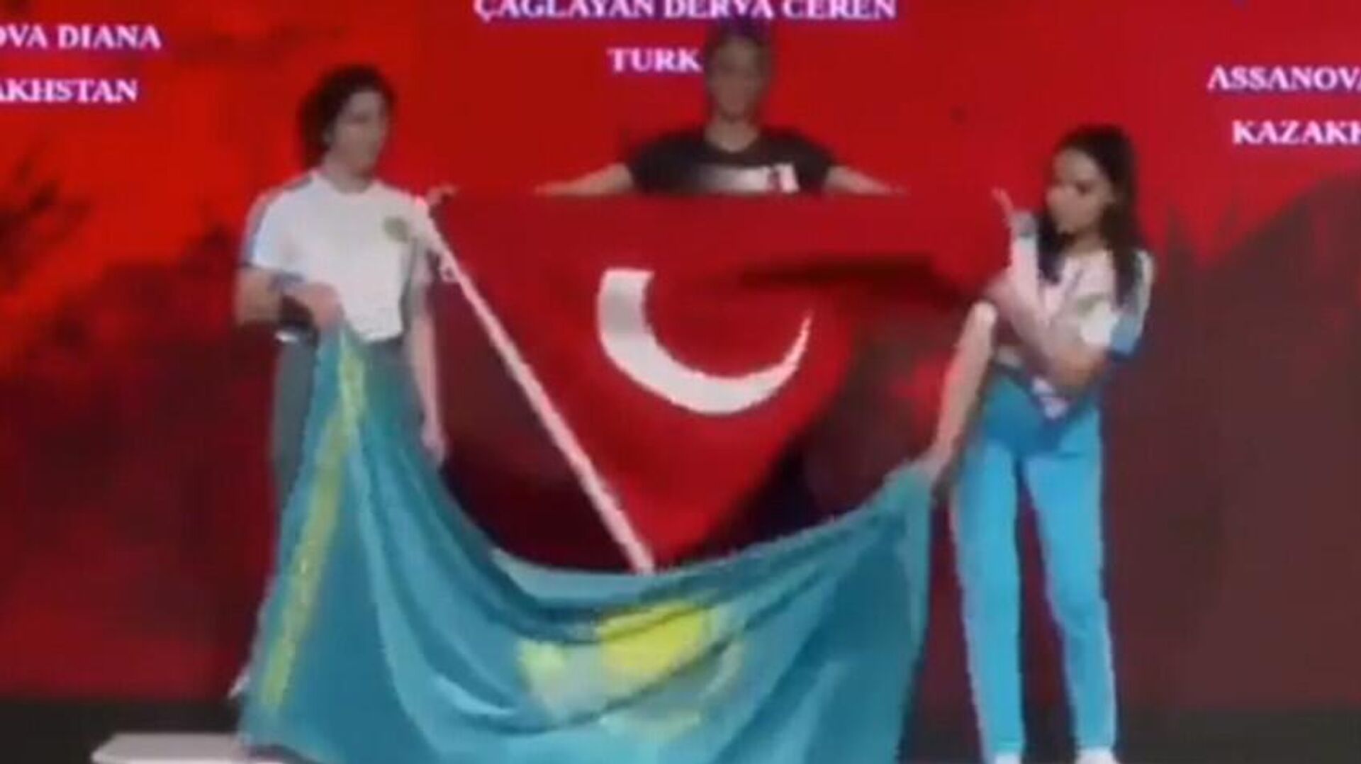 O anlarda, Kazakistanlı sporcular da Türk bayrağını kapatmaya çalıştı. Bu hamlelerinden sonra sporcu Derya Ceren Çağlayan, Türk bayrağını tekrardan açtı.