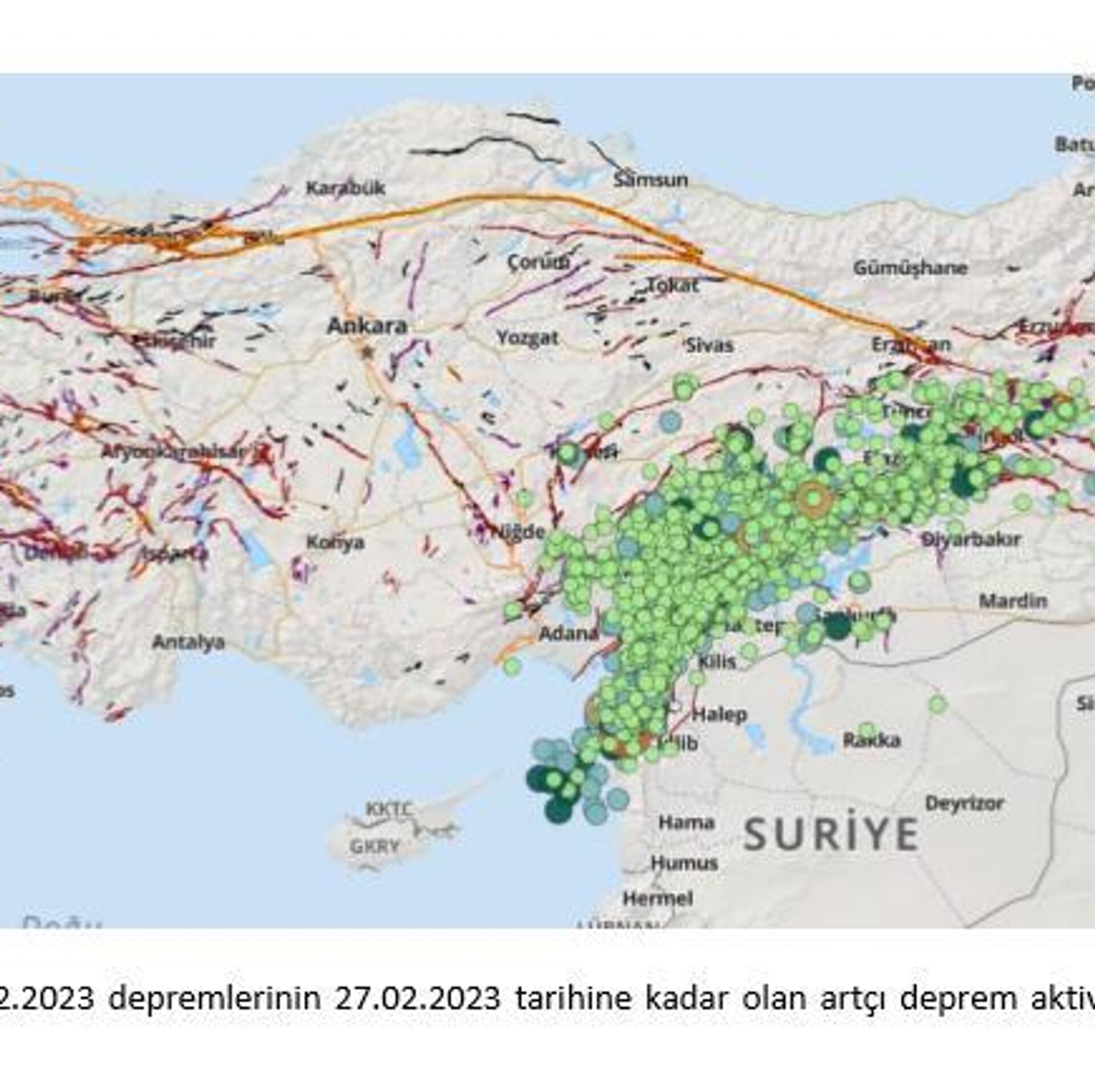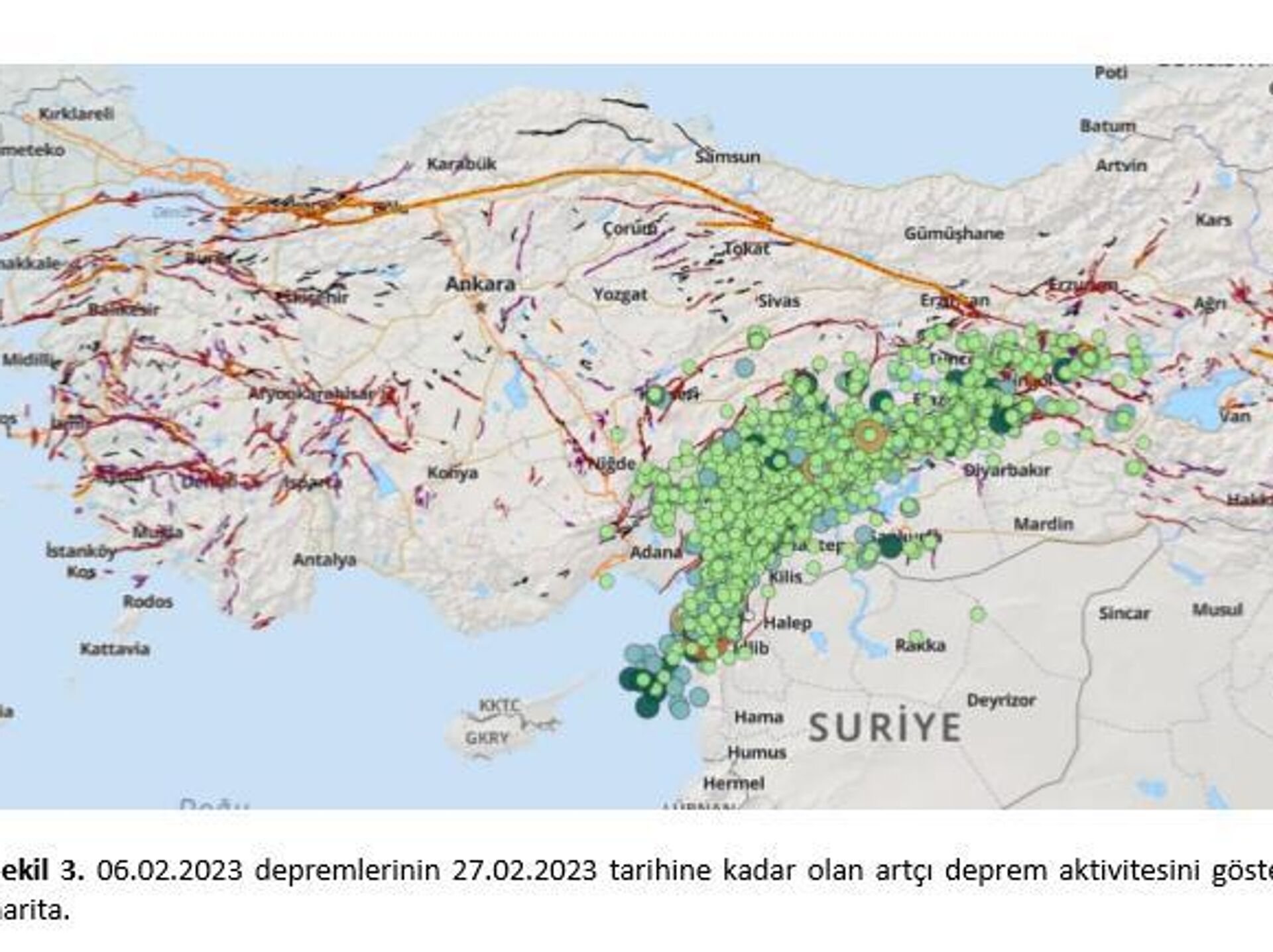 Ülke tarihinde yaşanmış en yıkıcı deprem fırtınası olarak kayıtlara geçen bu iki ana şoka ait kuvvetli yer hareketi kayıtları, saha gözlemleri ve bölge halkından alınan bilgilerle göre ilk depremin Kahramanmaraş ve Hatay’ da ikinci depremin ise özellikle Malatya’ da daha etkin oldu. 06.02.2023 günü, Türkiye saati ile 04.17`de meydana gelen ilk deprem Ölü Deniz Fay Zonu’nun en kuzey ucunda yer alan Narlı parçası üzerinde meydana getirmiştir. Sol yanal doğrultu atım karakteri gösteren kırık üzerinde 16 km’lik bir hat üzerinde yüzey kırığı tanımlanmış ve 1.4-3.0m arasında değişen yanal yer değiştirmeler gözlenmiştir. Kırık üzerinde 3 m’lik maksimum yer değiştirme Narlı Çiğdemtepe arasında yolda ölçülmüştür.