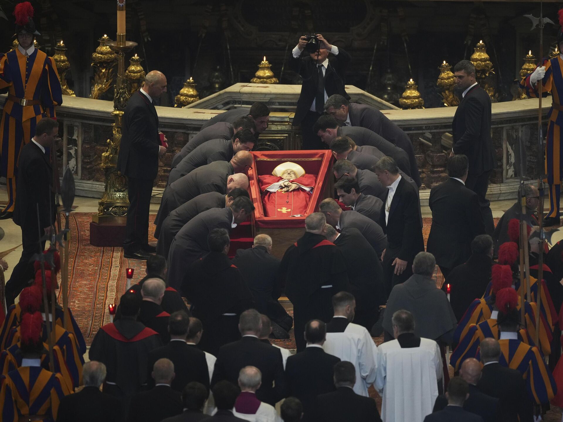 Öte yandan Papa Francis'in naaşı meydandaki kalabalığın arasından Aziz Petrus Bazilikası'na getirildi. Naaş, Vatikan'daki Aziz Petrus Bazilikası'ndeki yerine yerleştirildi ve törenle toprağa verilinceye kadar üç gün boyunca duracak.