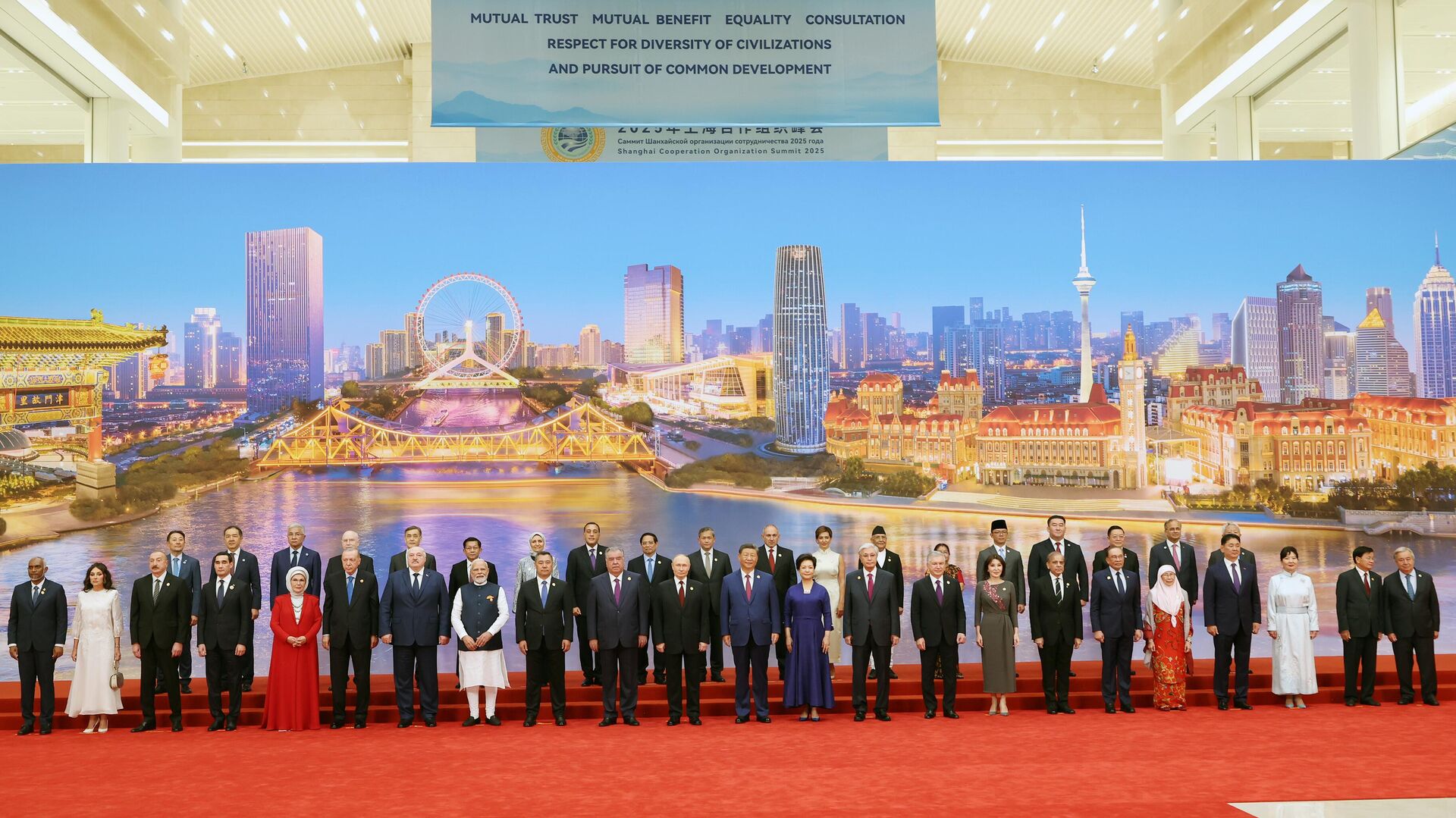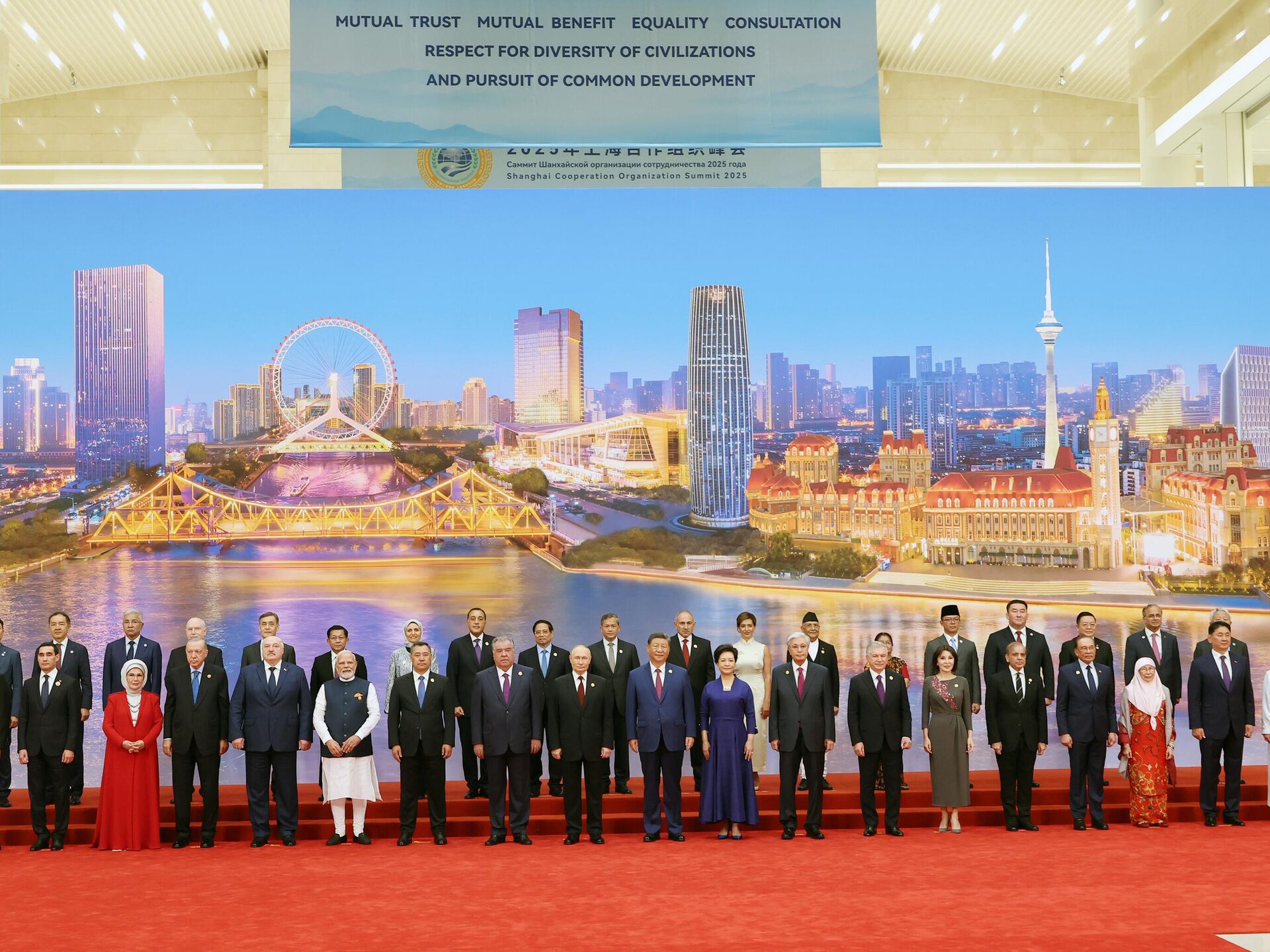 Şanghay İşbirliği Örgütünün 25. Devlet Başkanları Konseyi Zirvesi kapsamında Çin Devlet Başkanı Şi Cinping'in liderler onuruna vereceği akşam yemeği öncesi liderler aile fotoğrafı çektirdi. Dünya liderleri fotoğraf çekimi öncesi ayaküstü sohbet etti. Rusya Devlet Başkanı Putin'in yanı sıra Cumhurbaşkanı Erdoğan ve eşi Emine Erdoğan aile fotoğrafında yer aldı.Cumhurbaşkanı Erdoğan, Hindistan Başbakanı Narendra Modi ile selamlaştı.