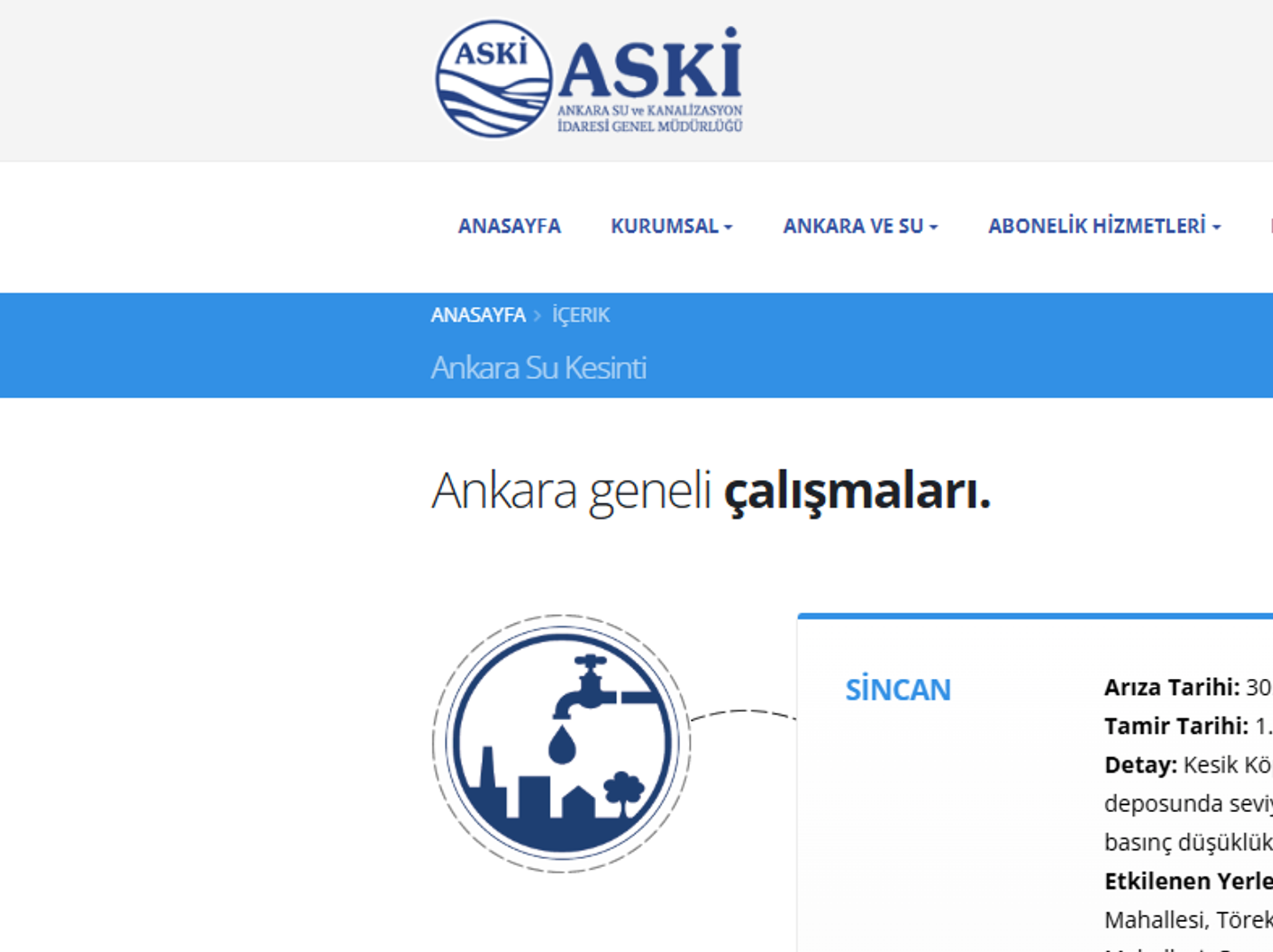 Açıklamada, "Boru arızasında yaşanan aksaklık giderildikten sonra normale dönüş sağlanacaktır. Barajlardaki doluluk oranıyla ilgili ASKİ su kesintisi yapmayı planlamamaktadır." ifadesi kullanıldı.