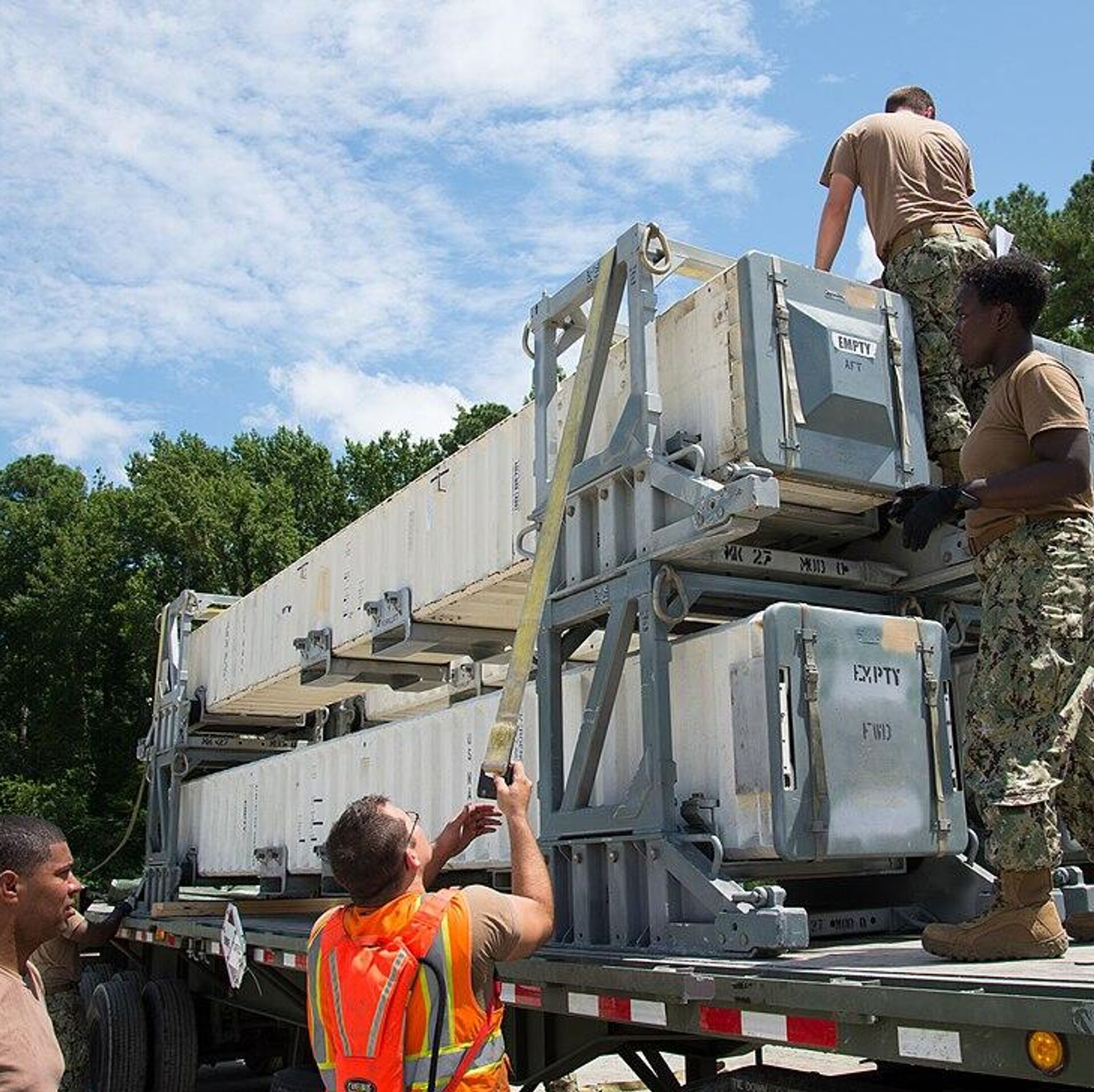 Militares estadounidenses descargan desde un avión de transporte contenedores con misiles de crucero Tomahawk - Sputnik Türkiye, 1920, 03.10.2025