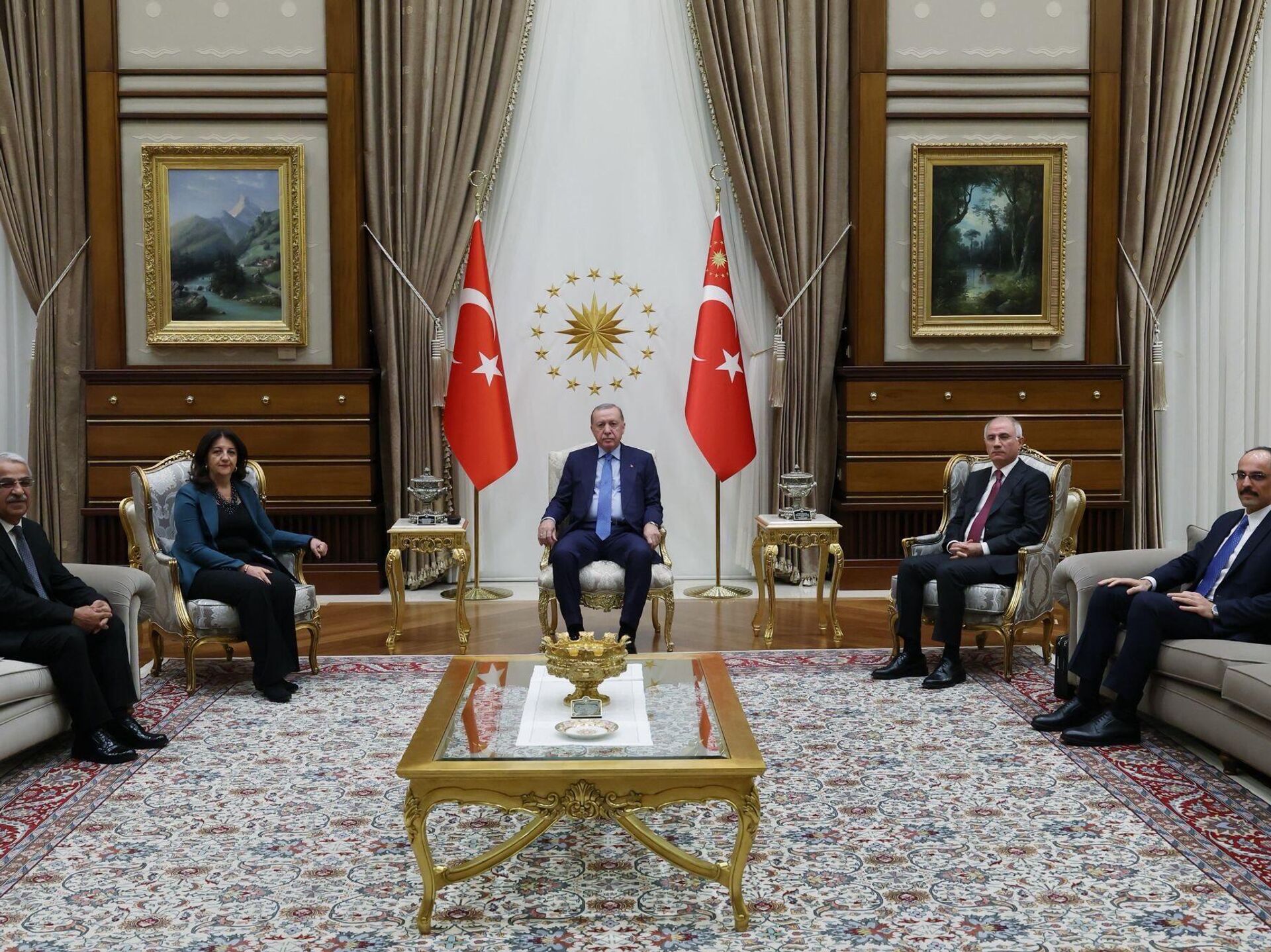 Cumhurbaşkanı Recep Tayyip Erdoğan, DEM Parti İmralı Heyeti üyeleri Pervin Buldan ve Mithat Sancar’ı kabul etti. Görüşme yaklaşık 1 saat sürdü. 30.10.2025, Sputnik Türkiye