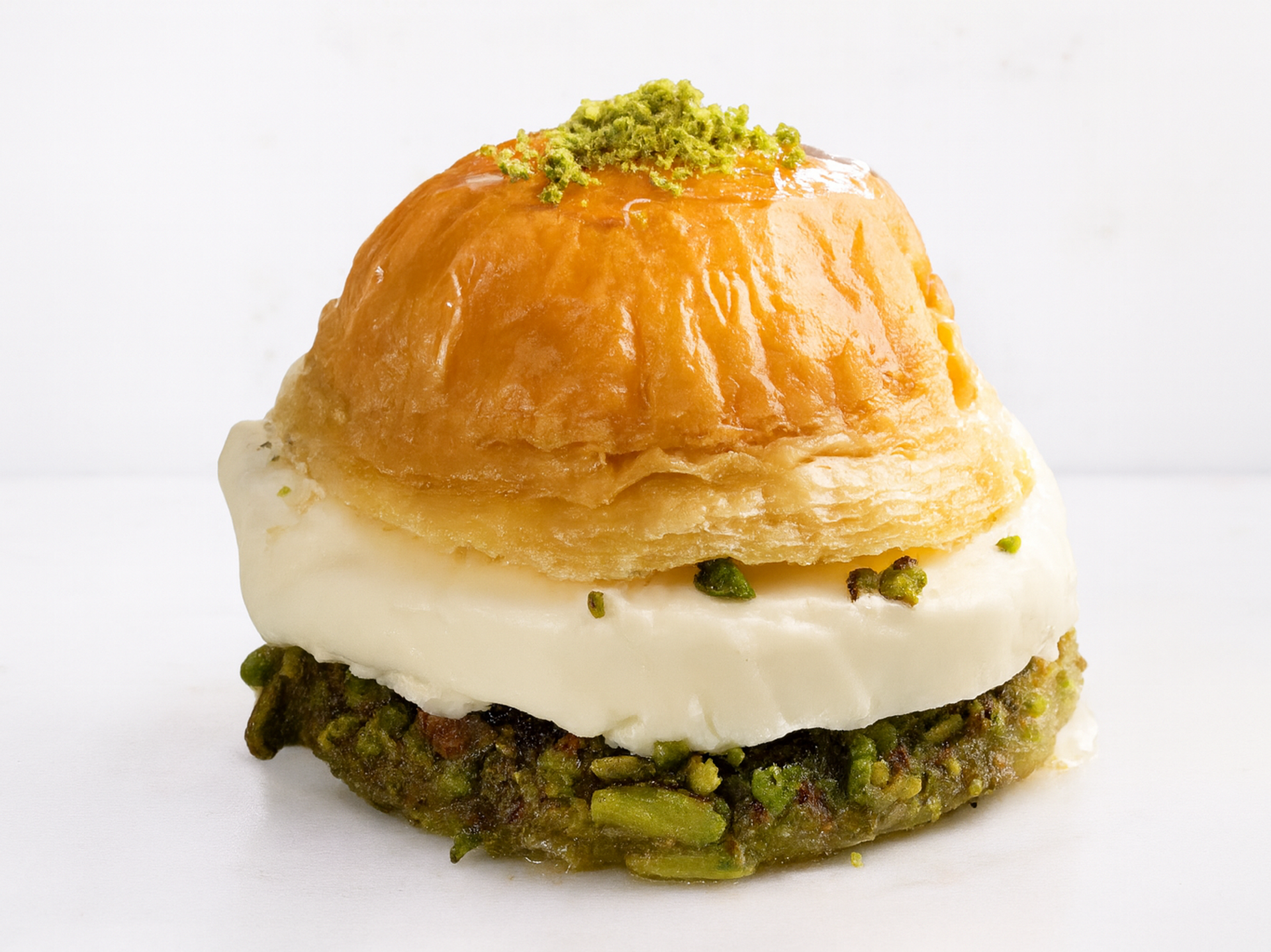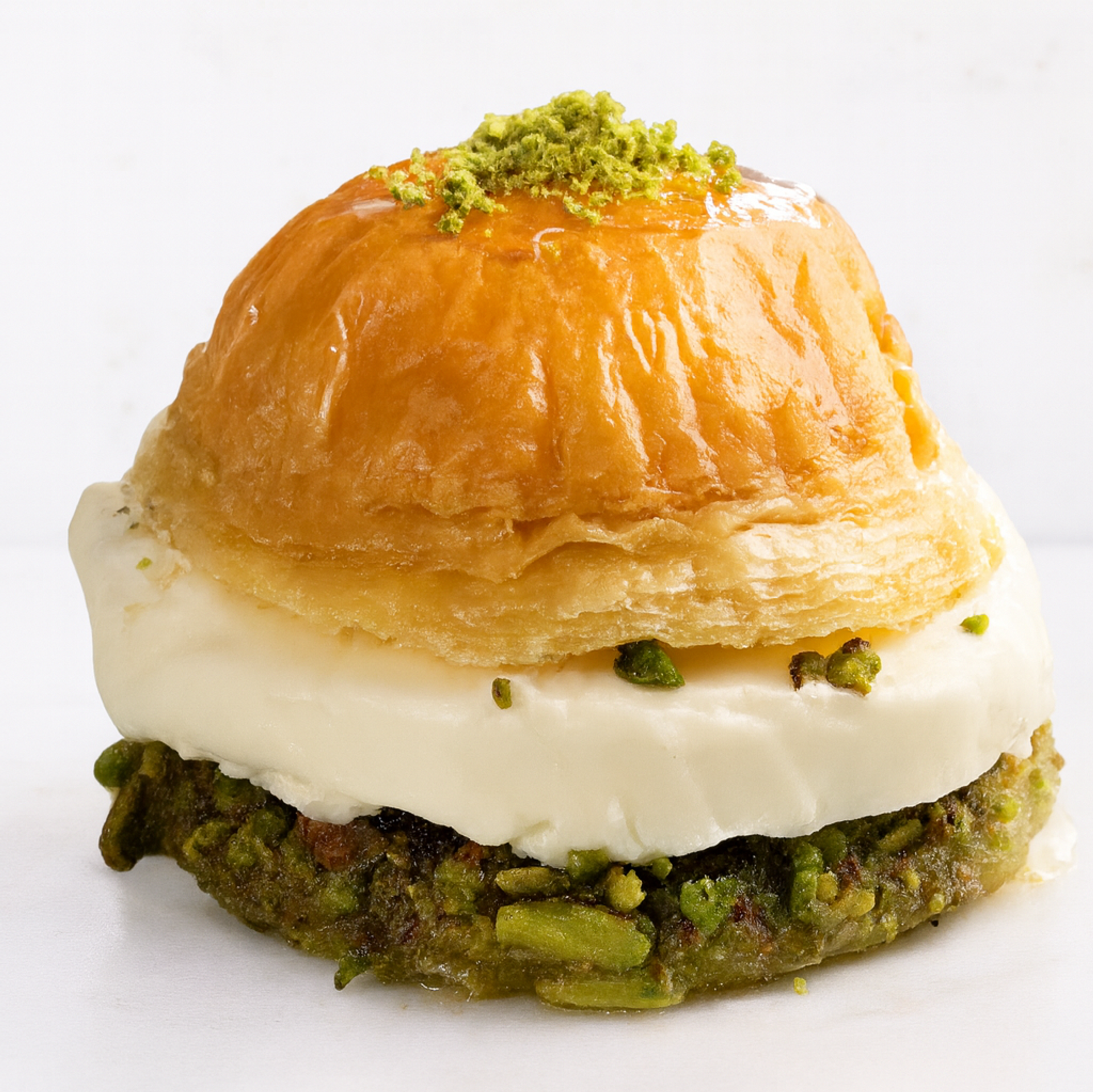 İncecik açılan milföy katmanları, Antep fıstığı ve kaymakla birleştirilerek burger şeklinde sunuldu. Hem görüntüsü hem de tabakta duruşuyla gerçek burgeri andıran bu tatlı versiyon, kısa sürede yüz binlerce kez paylaşıldı.