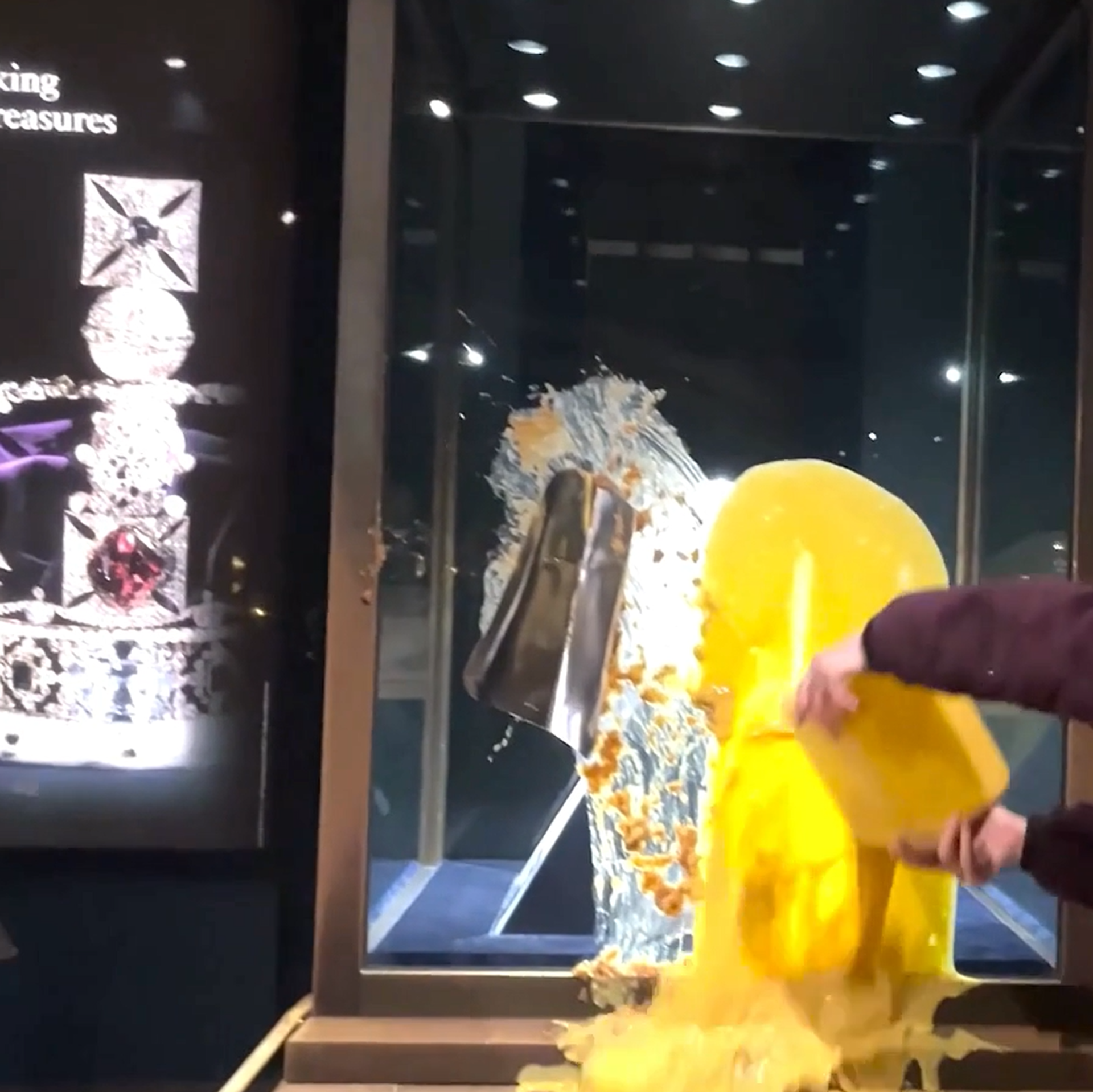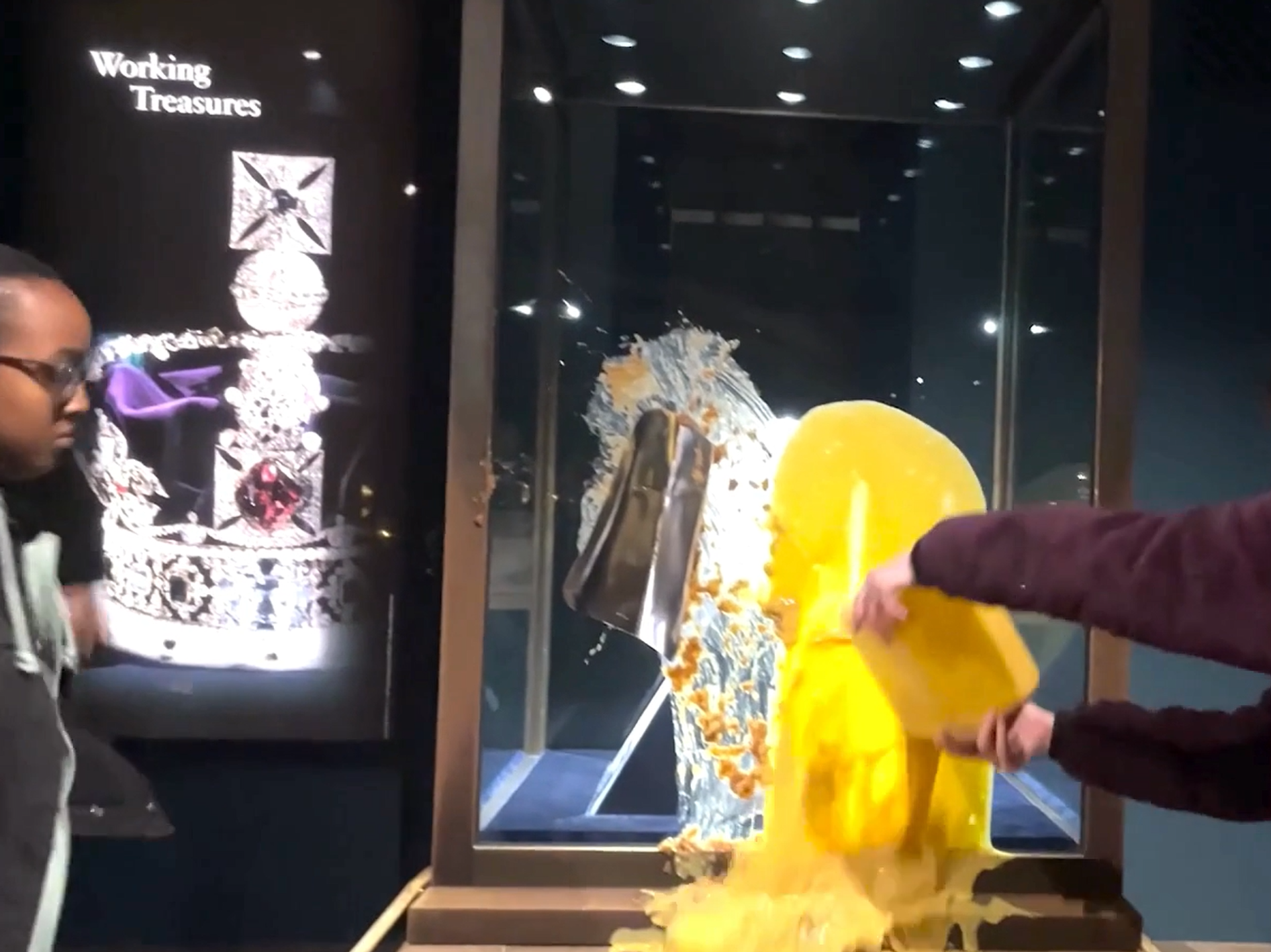 İngiltere’de kraliyet mücevherlerinin sergilendiği Londra Kulesi’nde bulunan İmparatorluk Tacı’nın cam muhafazasına muhallebi ve apple crumble fırlatıldı. Eylemi üstlenen “Take Back Power” grubu, aşırı zenginlerin daha fazla vergilendirilmesini talep etti.