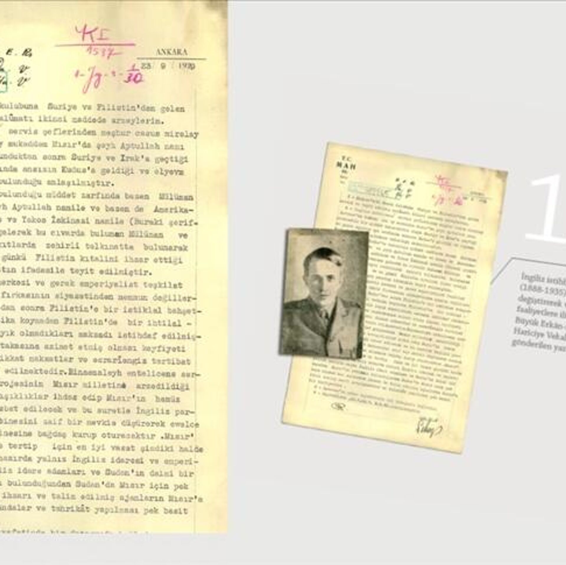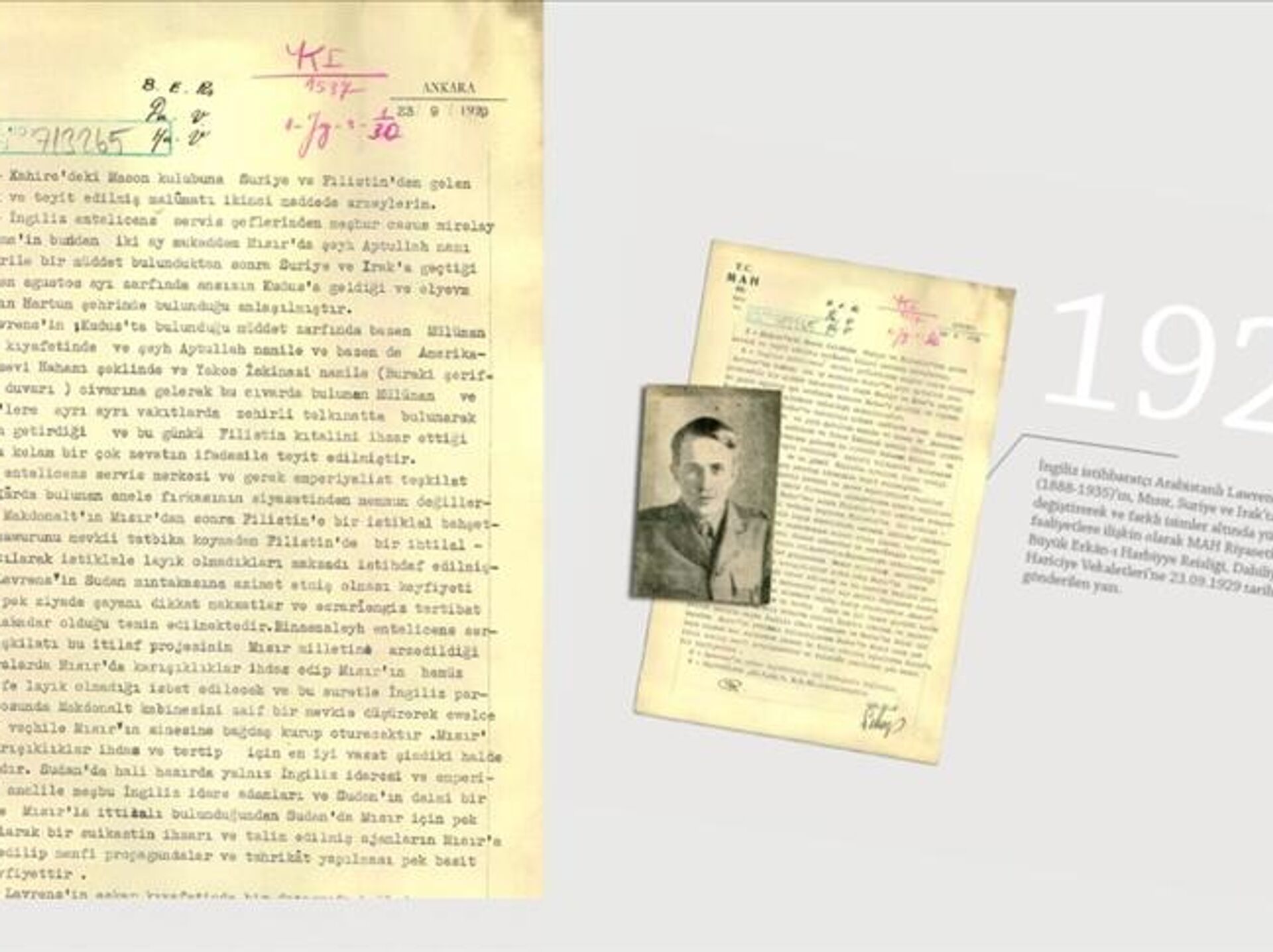 MİT'in resmi internet sitesinde, "Özel Koleksiyon" sekmesindeki "Belgeler" kısmında yayımlanan istihbarat raporlarına yenisi eklendi. Bu belge, "Arabistanlı Lawrence" olarak bilinen ünlü İngiliz ajanı Thomas Edward Lawrence'ın, Mısır, Suriye ve Irak'ta kıyafet değiştirerek ve farklı isimler altında yürüttüğü faaliyetlere ilişkin olarak Milli Emniyet Hizmeti Riyaseti tarafından hazırlanan 23 Eylül 1929 tarihli yazı oldu.