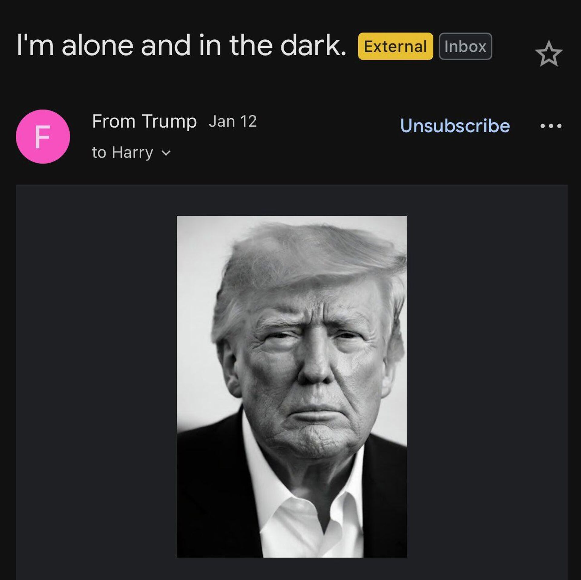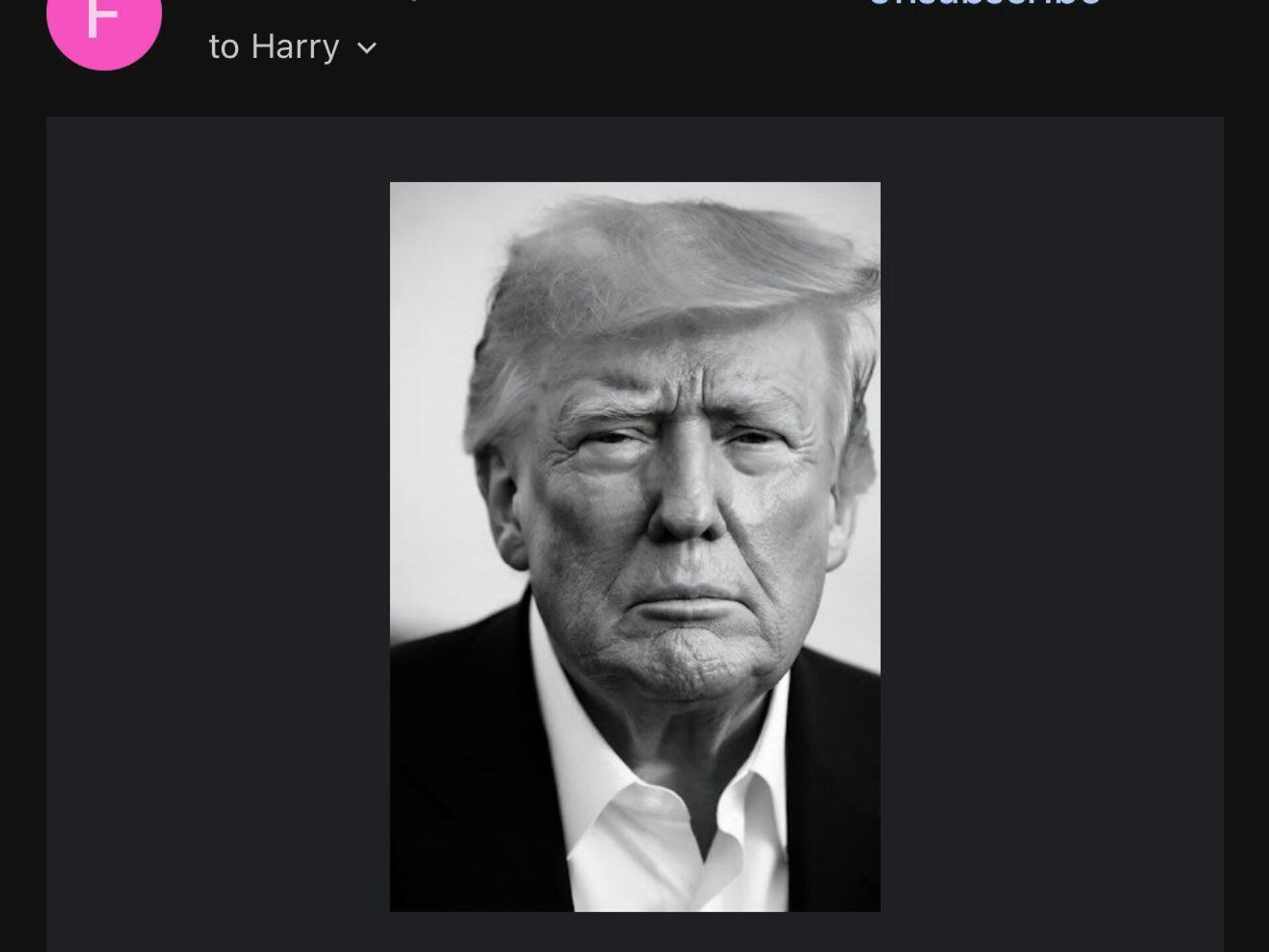 E-postada, ciddi bir yüz ifadesiyle çekilmiş Trump fotoğrafının ardından şu ifadeler yer aldı: