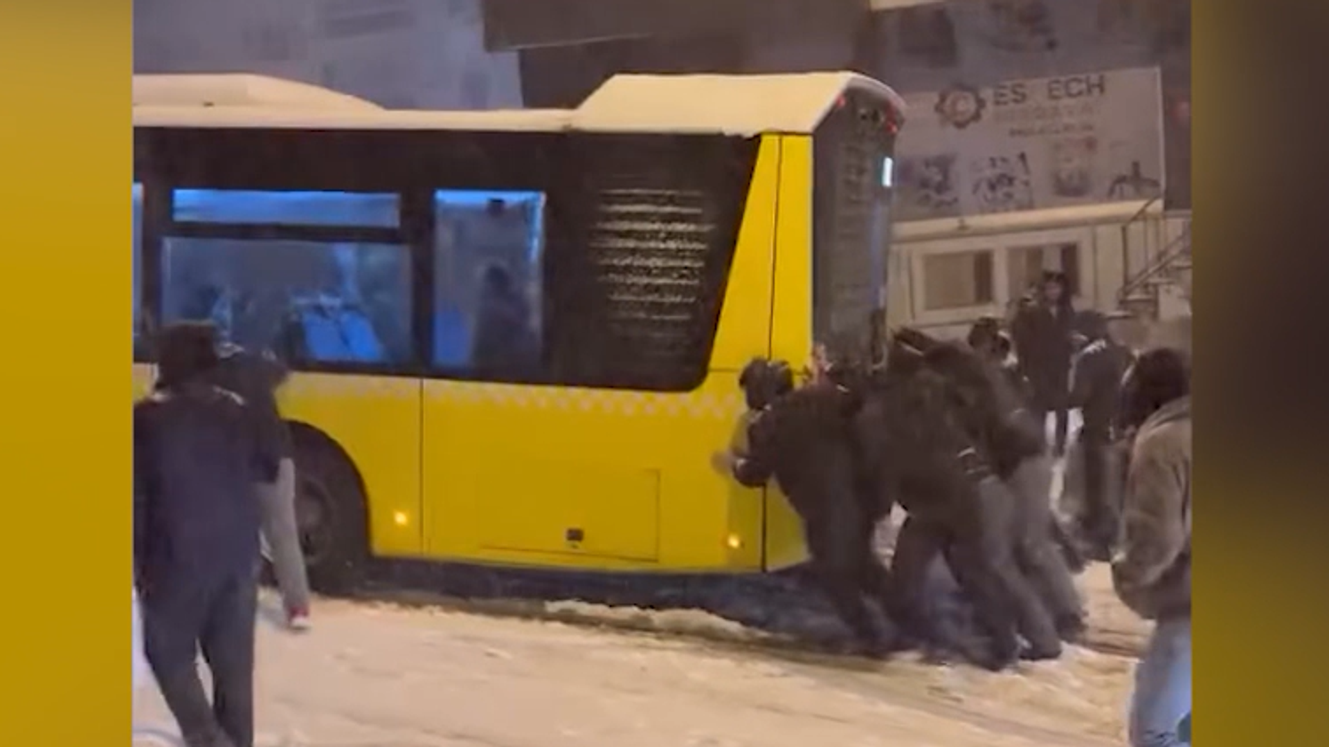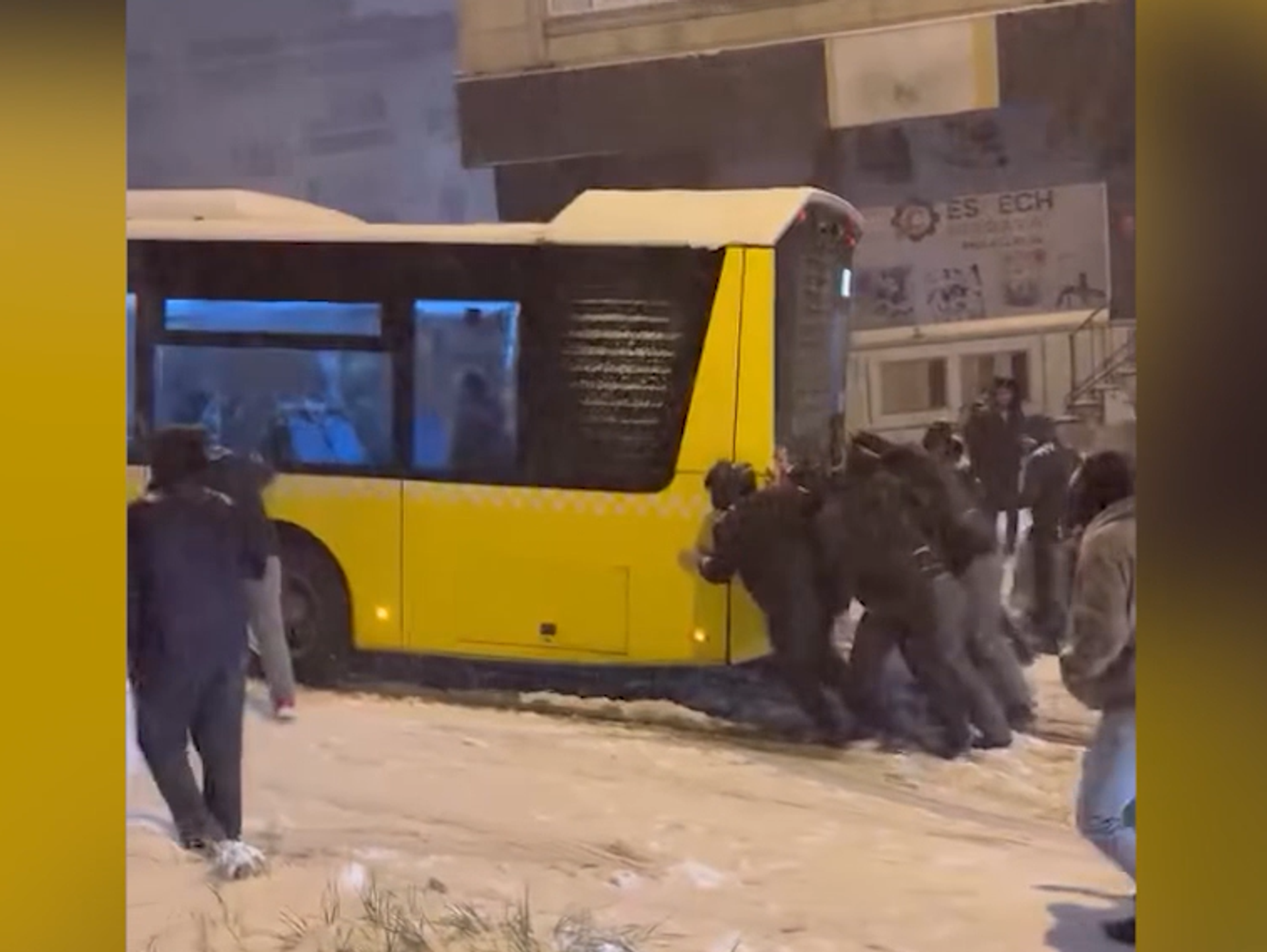 İstanbul yoğun kar yağışı ile beyaza büründü. Esenler'de aralıklarla etkisini sürdüren yağış nedeniyle bazı yollar ulaşıma kapandı.Sabah saatlerinde İETT otobüsü, Gazi Caddesi yokuşunu kar nedeniyle çıkamadı. Otobüs, çevredekilerin itmesi sonucu yoluna devam etti.Cep telefonu kamerasınca kaydedilen görüntülerde çevredekilerin yokuşu çıkamayan otobüsü itme anı yer alıyor.