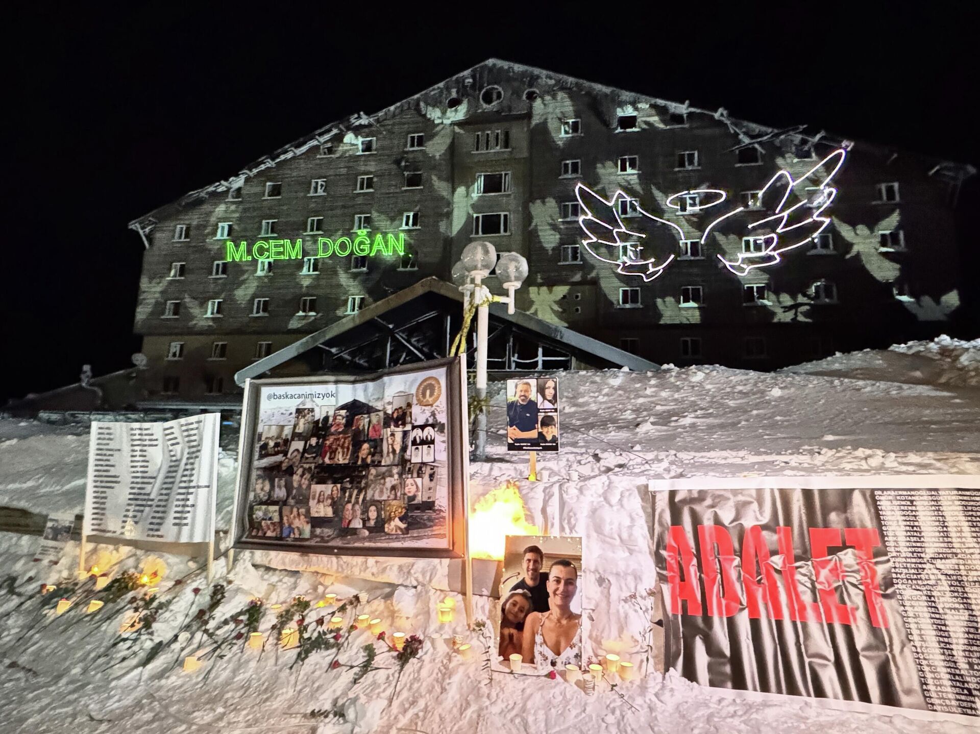 Yanan otelin önündeki alana hayatını kaybedenlerin fotoğraflarının konulmasının ardından karanfiller bırakıldı, mumlar yakıldı, dilek balonları gökyüzüne uçuruldu.Yangında yaşamını yitirenlerin isimleri ve "melek figürleri", lazerle otelin ön cephesine yansıtıldı.Bazı ailelerin gözyaşı döktüğü ve sarılarak birbirlerini teselli ettiği görüldü."Acılarımız hiçbir zaman eksilmedi"Yangında oğlu Yiğit Gençbay'ı yitiren Danıştay 9. Daire Başkanı Abdurrahman Gençbay, gazetecilere, tam bir yıl önce, bunun gibi zifiri karanlık bir gecede 78 canlarını kaybettiklerini söyledi.Çok basit şekilde çıkan ve kendi kendine sönümlenebilecek bir yangının, organize kötülükler, hatalar, kusurlar, kasıtlarla faciaya, insan kaybı açısından dünyada 6'ncı büyük otel yangınına dönüştüğünü belirten Gençbay, "Maalesef bu topluma yakışmayan bir fotoğraftı. Biz 1 yıl önce bu fotoğrafla karşılaştık ve evlatlarımızı, canlarımızı kaybettik." dedi.Gençbay, aradan geçen sürede acılarının katlanarak büyüdüğünü anlatarak, "Acılarımız hiçbir zaman eksilmedi. Zaman küllendirmedi, daha da artırdı ama bu sürede tutunduğumuz tek şey vardı. Bu organize kötülüğe karışan kişilerin hak ettikleri cezaları almaları açısından adalete tutunmak istiyorduk. Adaletten medet umuyorduk. Çok şükür ki bunun da karşılığını en azından ilk etapta mahkeme aşamasında görmüş olduk." diye konuştu.Bir yıla yakın süren yargılama sonucunda Bolu 1. Ağır Ceza Mahkemesinin toplum vicdanında da yerini bulan ve emsal olabilecek karara imza attığını ifade eden Gençbay, şöyle devam etti:"Bu tür organize kötülüklerin bir daha yaşanmaması, toplumları içten içe kemiren cezasızlık algısının bu toplumun gündeminden sökülüp atılması, 'yapanın yanına kar kalıyor' algısının sökülüp atılması için emsal olabilecek karara imza attılar. Bu karar toplumda karşılığını da buldu çünkü artık anneler karşılaştıkları kötülükler karşısında 'Kartalkaya adaletini' ister duruma geldiler. Acılı annelerin, acılı insanların, adaletin tecellisini mahşerde, mahkeme-i kübra'da değil, artık bu dünyada da bu adalet sistemimizden de alabileceklerine inançları geri geldi.""Düşünmediğimiz, dua etmediğimiz, anmadığımız hiçbir an olmadı"Yiğit Gençbay'ın teyzesi Sibel Özdemir de söyleyecek çok sözlerinin olduğunu belirterek, "Biz öldük, dünyada kaldık. 365 gün, düşünmediğimiz, dua etmediğimiz, anmadığımız hiçbir an olmadı. Çok üzgünüz. Allah'ım sabırlar versin." ifadesini kullandı.Yangından kurtulan ve insanları kurtarmak için tekrar girdiği otelde yaşamını yitiren yeğeni Gençbay ile arkadaşı Alp Mercan ve hayatını kaybeden 34 çocuğun teyzesi olduğunu aktaran Özdemir, "Biz artık yaşamaya devam etmeye çalışıyoruz. Sevdiklerimiz ve geride kalanlar için tek isteğimiz adaletin yerini bulması." şeklinde konuştu.Yangında annesi Gülçin, ağabeyi Şenol ve 11 yaşındaki yeğeni Mina Akişli'yi kaybeden Oktay Akişli ise artık her şeyini kaybetmiş birisi olduğunu söyledi.Bütün hayallerinin ve umutlarının ellerinden alındığını dile getiren Akişli, şunları kaydetti:Ailelere destek için İstanbul'dan gelen Can Kaya, Tolstoy'un "Acı duyabiliyorsan canlısın ama başkasının acısını duyabiliyorsan insansın." sözünü anımsatarak, kendisinin de başkalarının acılarını paylaşmak için buraya geldiğini vurguladı.