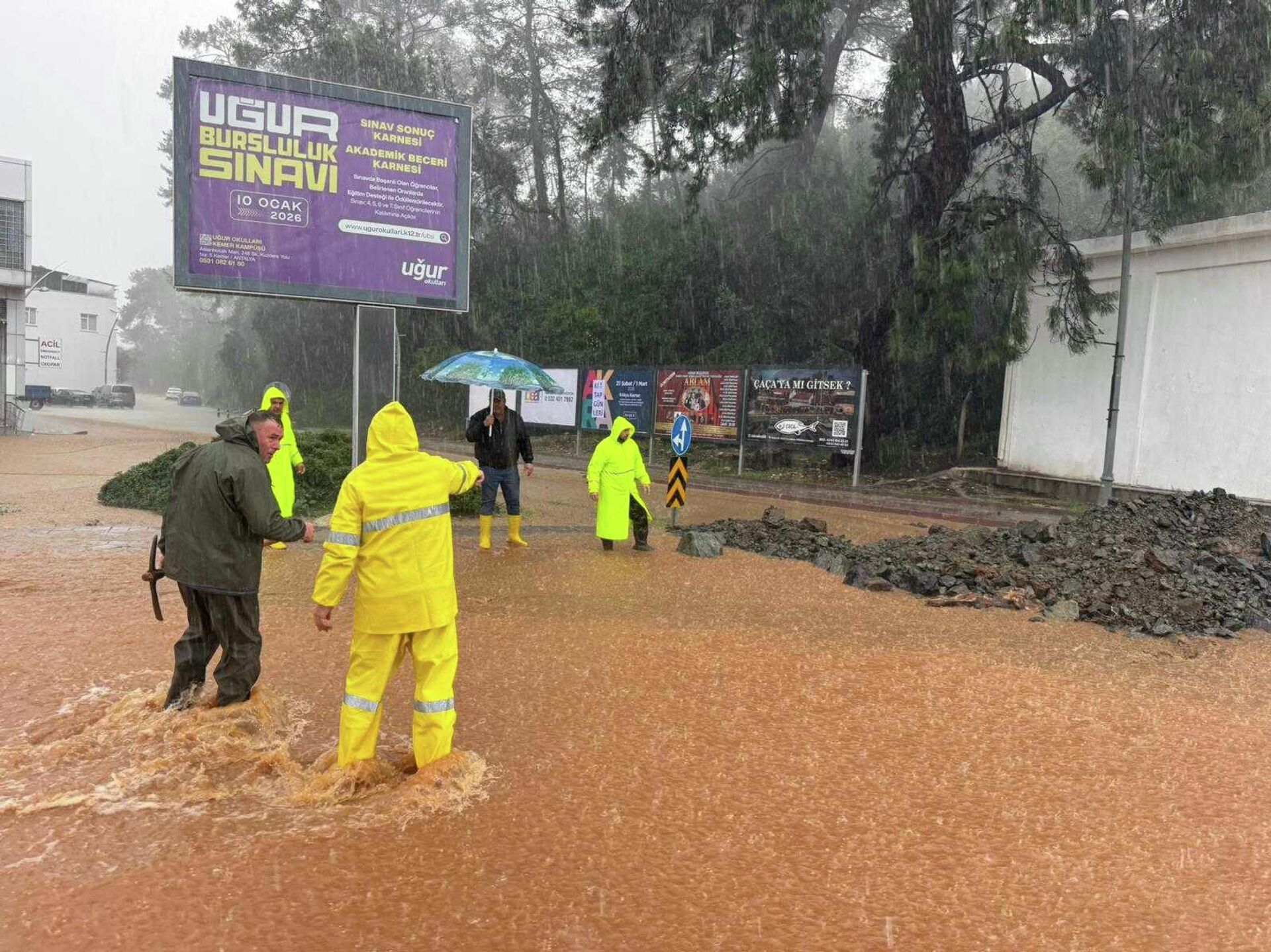 Kemer ilçesinde de sağanak nedeniyle çok sayıda cadde ve sokakta su baskınları oluştu. Belediye ekipleri suları tahliye ederken derelerin taşmaması için iş makineleriyle çalışma yaptı.