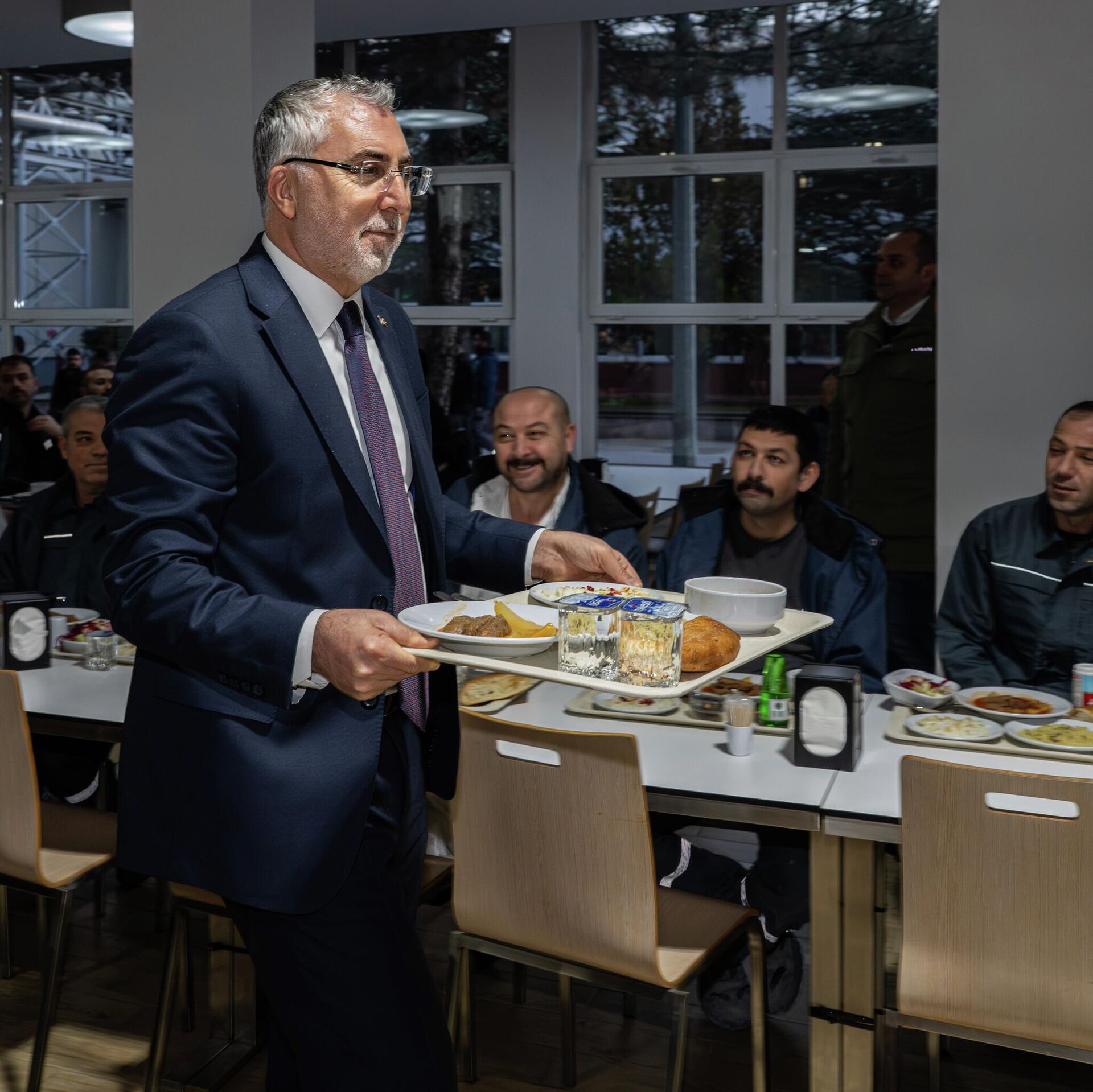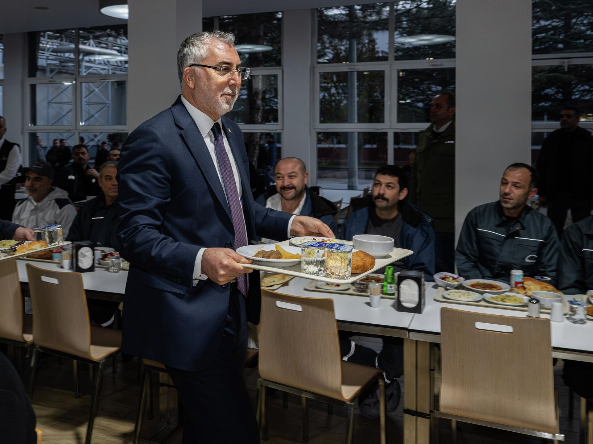 Dünyaca ünlü otomotiv ve makine imalat şirketine ait fabrikayı ziyaret eden Çalışma ve Sosyal Güvenlik Bakanı Vedat Işıkhan, iftar saatine yakın işçilerle birlikte sıraya girerek yemeğini aldı.