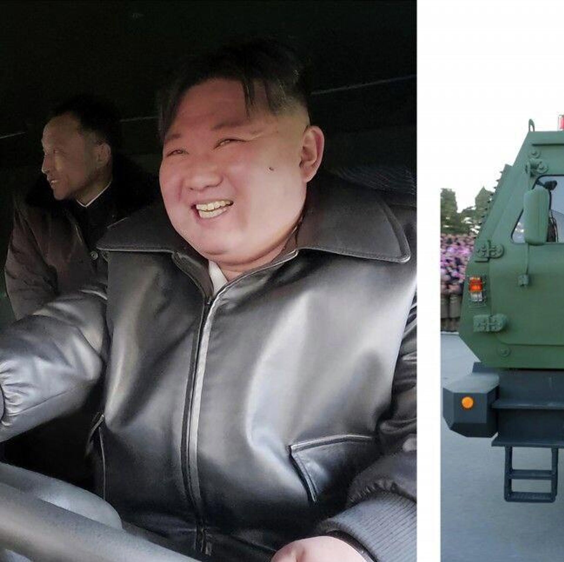 Ajansın yayınladığı fotoğraflarda, Kim Jong-un'un yeni savaş aracıyla meydanda dolaşırken, sıralanmış silahları ve 25 Nisan Kültür Evi meydanında toplanan insanları incelediği ve gülümsediği görülüyor.