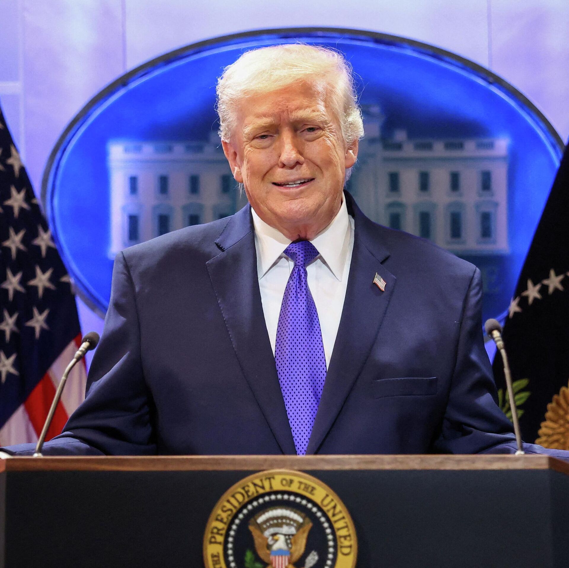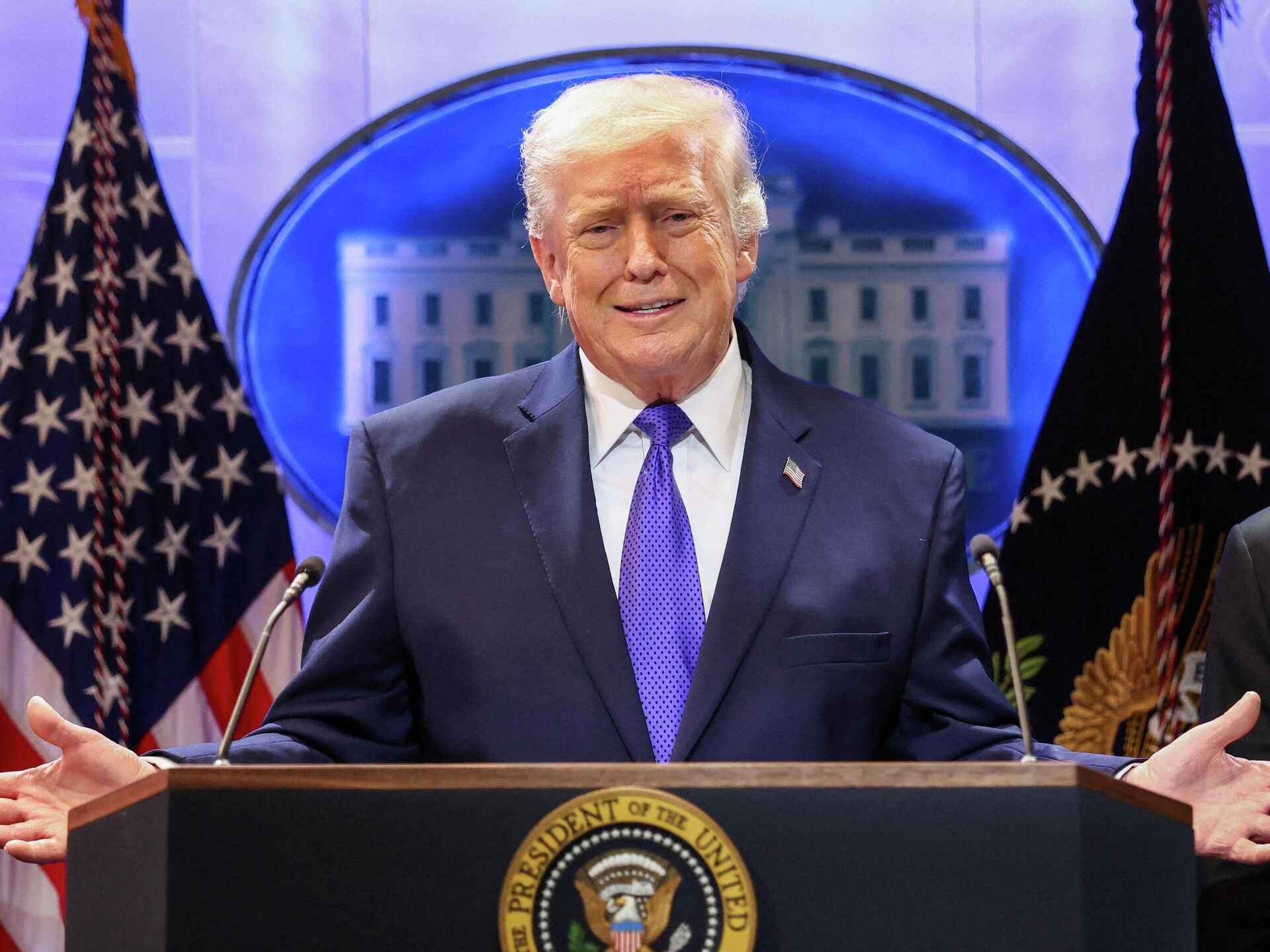 © REUTERS Kevin LamarqueПрезидент США Дональд Трамп жестикулирует во время выступления во время брифинга для прессы в Белом доме, США