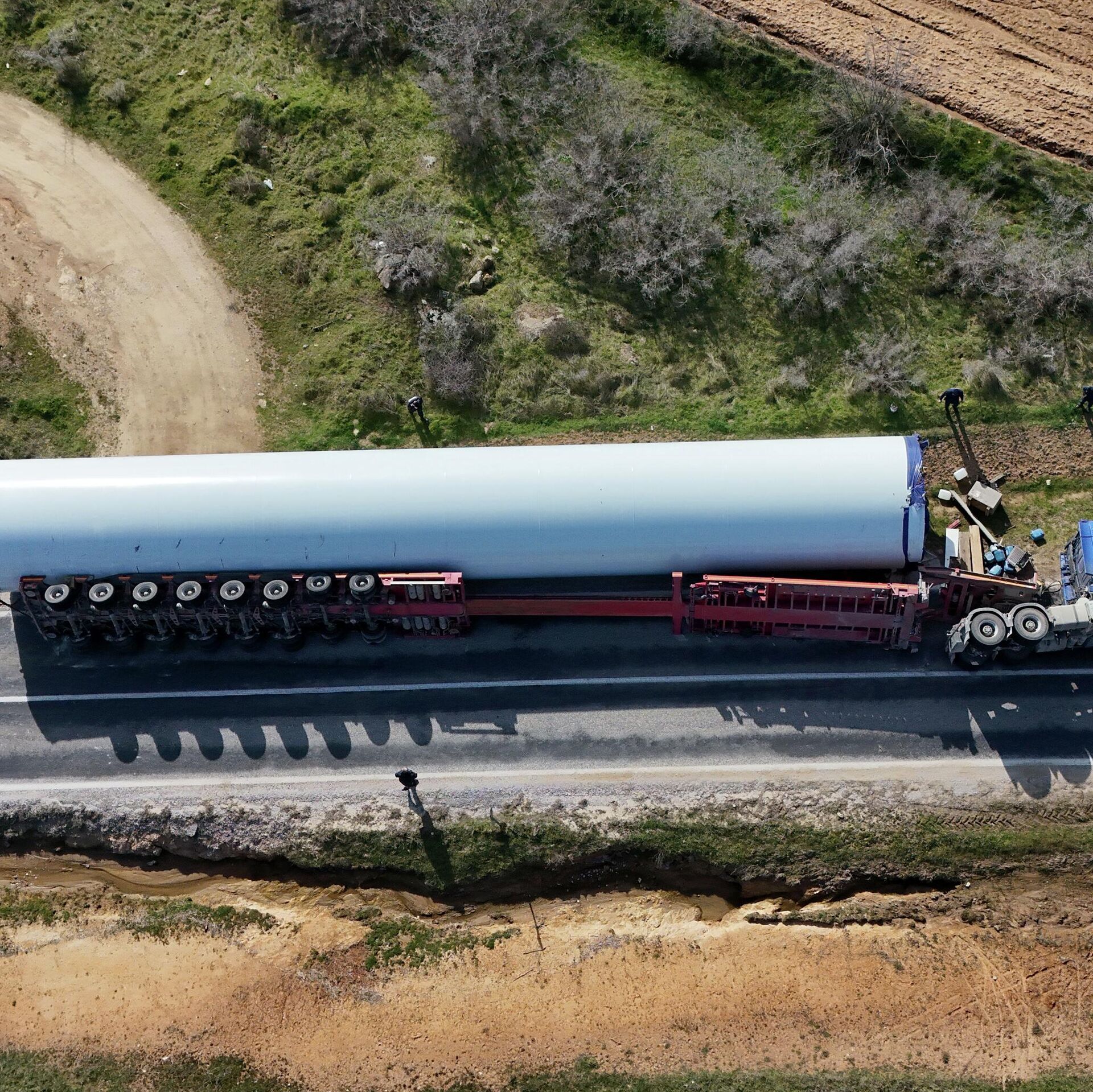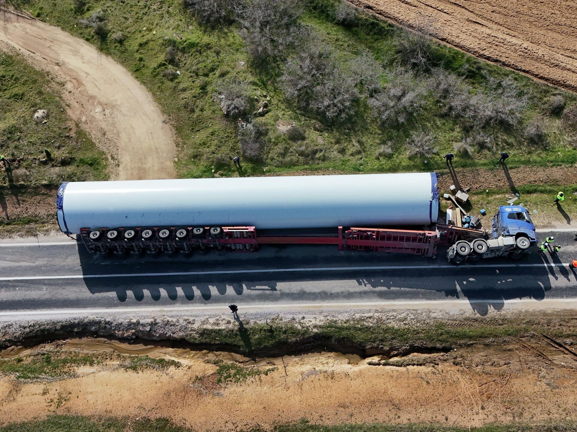 Rüzgar türbini taşıyan TIR devrildi: Araçta sıkışan sürücü itfaiye ekiplerince çıkarıldı