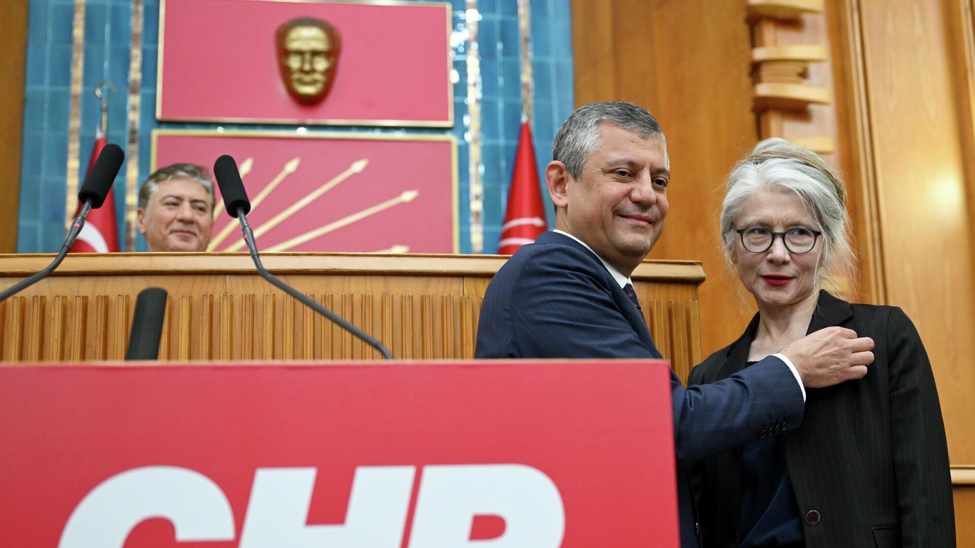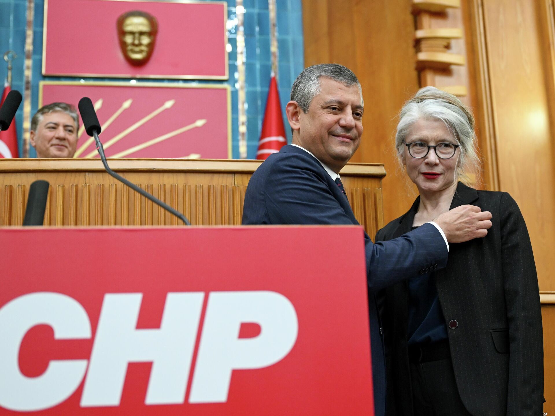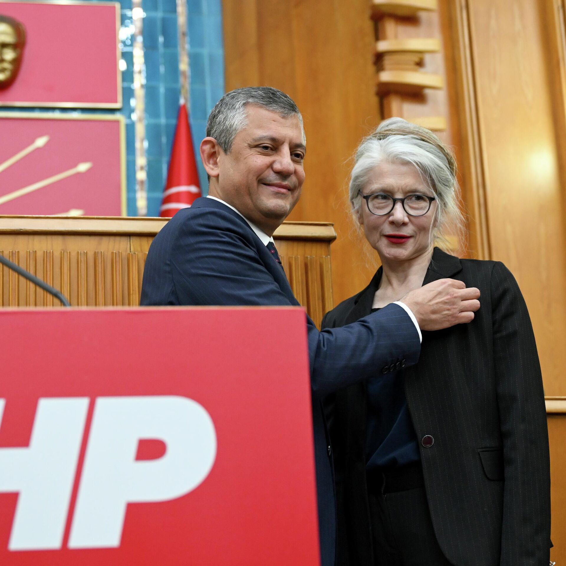 Emine Ülker Tarhan, CHP'nin bugünkü grup toplantısında partiye katıldı. Tarhan'ın rozetini CHP Genel Başkanı Özgür Özel taktı.