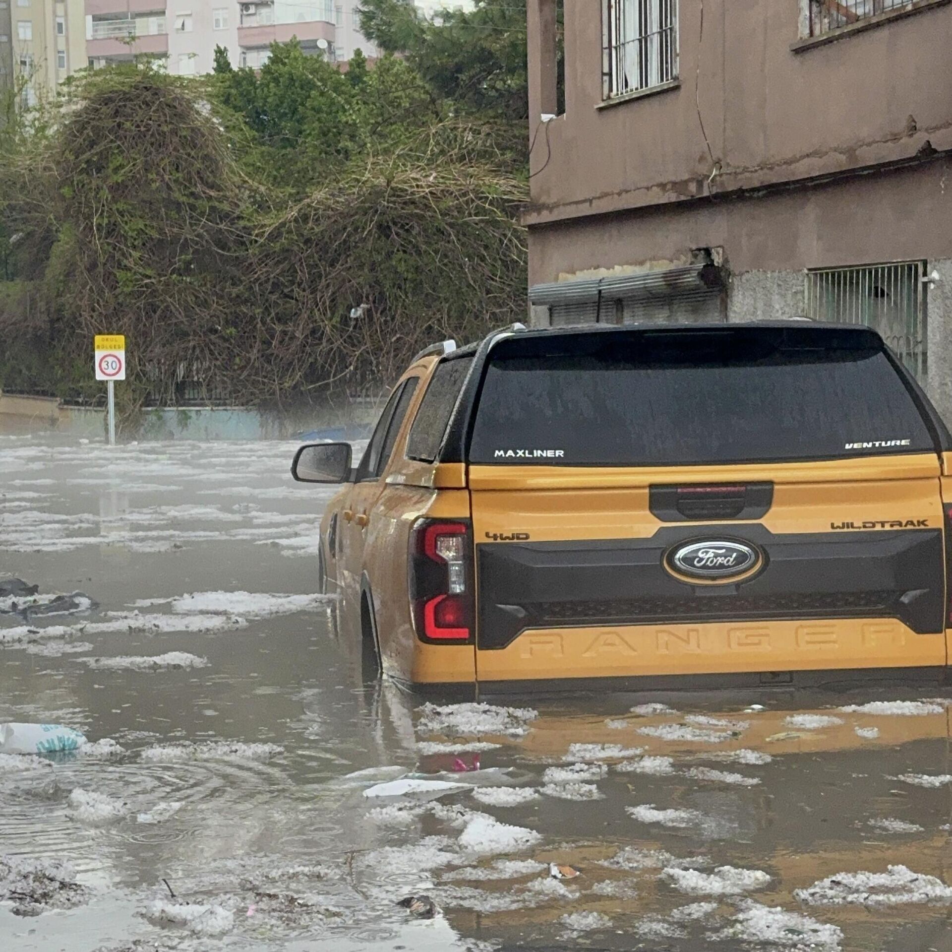Burada bir minibüs de yağmur suyuyla sürüklenerek zarar gördü. Aracın sürücüsü Ahmet Çiçek, aracını temizlemek için yol kenarına park ettiği sırada sağanak ve dolu yağışının başladığını ve bu sırada aracının sürüklendiğini söyledi.