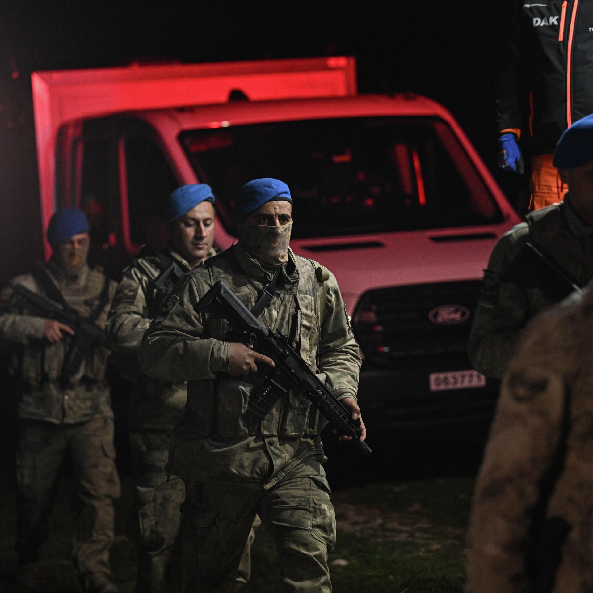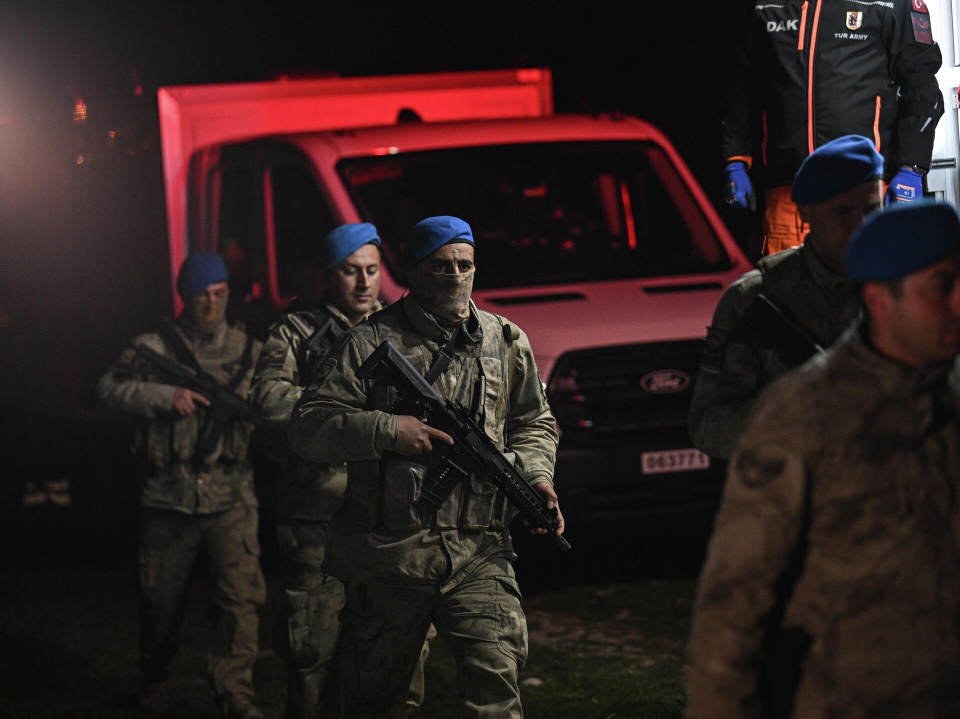 Bölgede, Türk Silahlı Kuvvetleri (TSK) Doğal Afetler Arama Kurtarma timi ile askeri yetkililer incelemelerilerde bulunuyor.